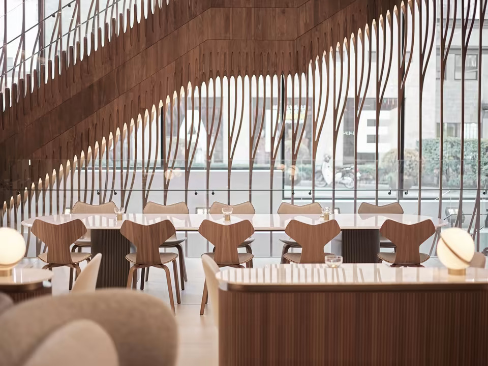 Общая зона для обслуживания клиентов спроектирована по принципу Open Space и разделена на сектора: зона самообслуживания, кассовая зона и коворкинг. Это решение нашло отражение в цветовой подаче.